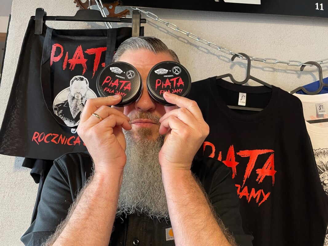 Na Piątą Rocznicę Jamy, która odbyła się 4 września wypuściliśmy hybrydową pomadę do włosów. Moja tęsknota za tamtą matową gliną była duża. Chciałem jednak troszkę innego produktu. Miał być bardziej woskowy, choć wciąż twardy i z matowym finiszem. Edwin z Pomps Not Dead pomade, bo to z nim miała się odbyć ta kooperacja od razu zrozumiał o co kaman. Napisał, że „no problem” i że rozumie temat. Chwilę trwało zanim odważył i uwarzył gotową woskowinę, a ja już nawet bałem się, że nie zdążymy na czas. Wrzesień się zbliżał…Sami wiecie jak teraz to wszystko wygląda: wysyłki, cło itd., ale poszło nadzwyczaj sprawnie jak na taką operację. Jednak efekt „Piątej Fali Jamy”, bo tak nazwaliśmy ten kosmetyk, przeszedł moje najśmielsze oczekiwania. Pudełko z logotypem rocznicy, naszym okrągłym znaczkiem oraz deskorolką producenta. Egzotyczny, ale bez przesady zapach mango kontra banan jest totalnie i rewelacyjnie przepyszny. Można by go łyżkami jeść! Sam produkt jest rzadkością na rynku. Dość twardy, ale łatwy w wyskrobywaniu i nabiera się go bez podgrzewania. Łatwa rozcieralność plus niewielka ilość produktu potrzebna do stylizacji ustawiają ten wybór w czołówce jakości i ekonomiczności. To nie jest glina, więc rozsmarowuje się bez problemu do postaci niewidzialnej żywicy. Finisz jest świetny i rzadko spotykany. Matowy strzał z lekkim błyskiem pod światło. Doskonałe do fryzur zwariowanych, out of bedów, cropów, kolcy, nowoczesnych ułożeń i tym podobnych wariactw. Nie należy używać na mokre włosy. Jego twardość nie wchłonie się na wodzie. Nadaje się też do fryzury tradycyjnej, ale tylko na dobrze wysuszone włosy w celu podkreślenia i utrwalenia wyskakujących pojedynczych włosideł. To ostatnia właściwość jest szczególnie ciekawa, bo pokazuje hybrydowość produktu nie tylko w zakresie konsystencji i zawartości. Bo również w kwestii doboru produktu do różnych fryzur „Piąta Fala Jamy” dobrze się nadaje.