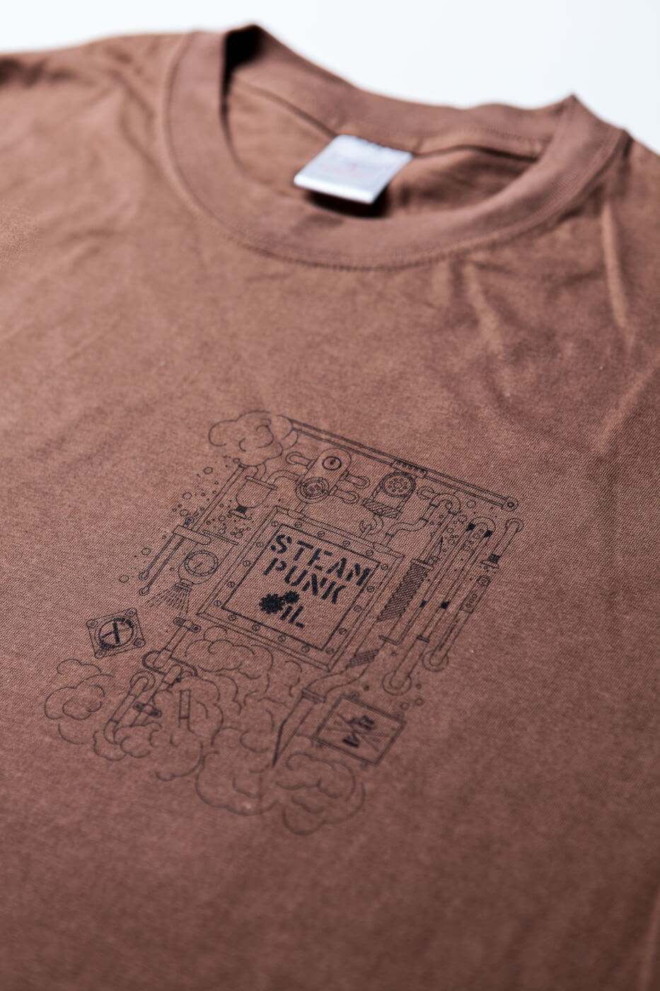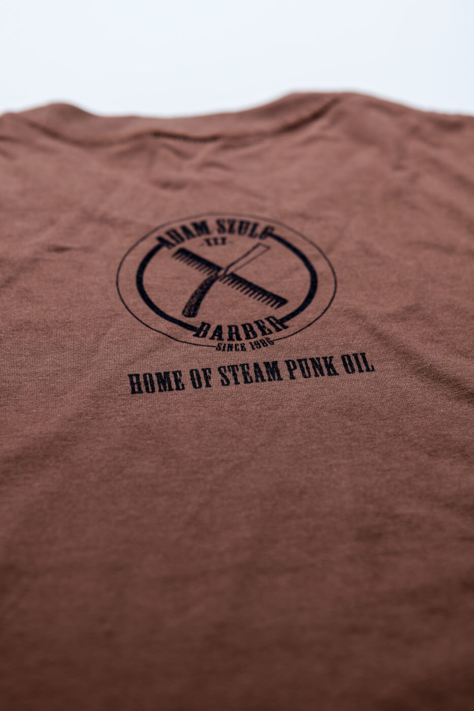 -na plecach w górnej części znany logotyp Adam Szulc Barber z podpisem „Home of Steam Punk Oil”