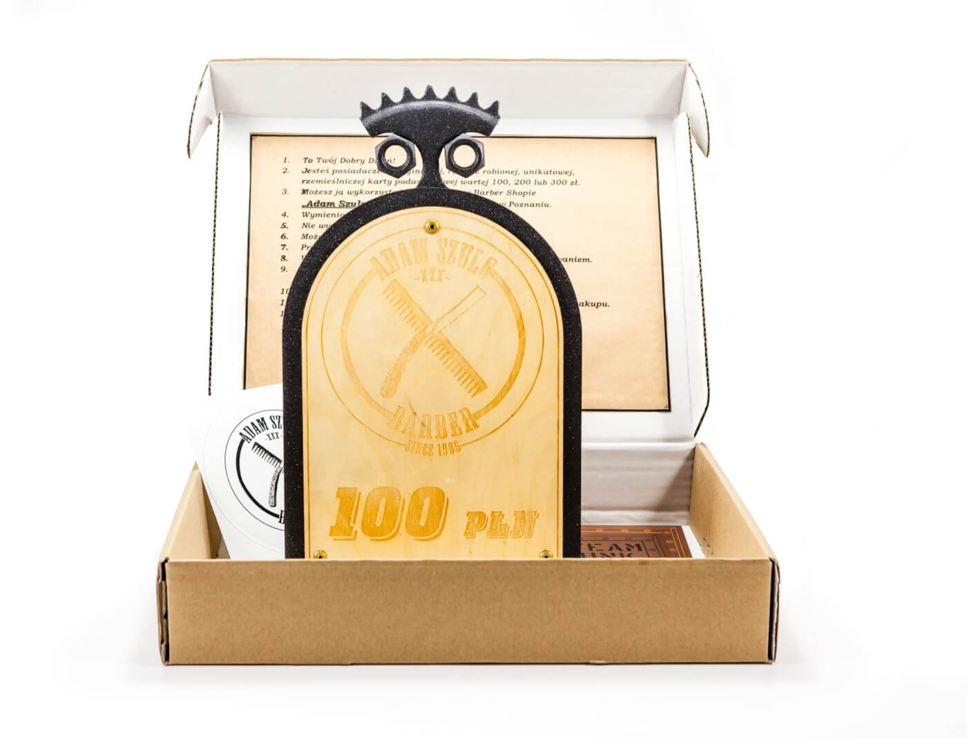 Trudno go nazwać karta podarunkową. To żelazno- drewniany, bardzo męski i stylowy voucher na usługi lub kosmetyki (albo jedno i drugie) do jednorazowego wykorzystania w barber shopie Adam Szulc Barber na os. Stare Żegrze 38 w Poznaniu.