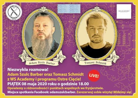 Piątek 08.05.2020 godz. 18.00Miejsce: fb adamszulcbarberRozmowa Adam Szulc x Tomasz Schmidt:Projektant koloru. Fryzjer stylista z ponad dwudziestoletnim stażem. Współprowadzący popularny program w TV TTV "Ostre Cięcie", w którym z wielkim...